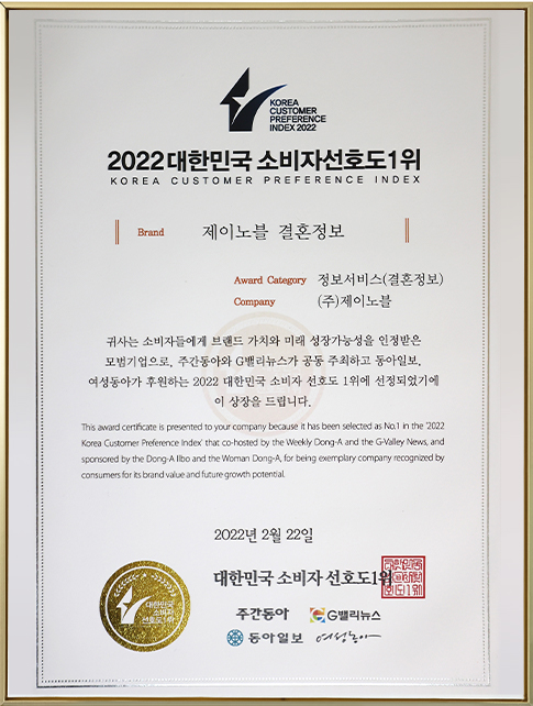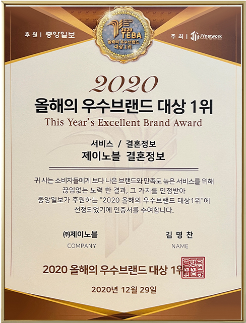 대한민국이 공식적으로 인증한 제이노블은 차원이 다른 서비스 품질과 성혼 전문성을 바탕으로,